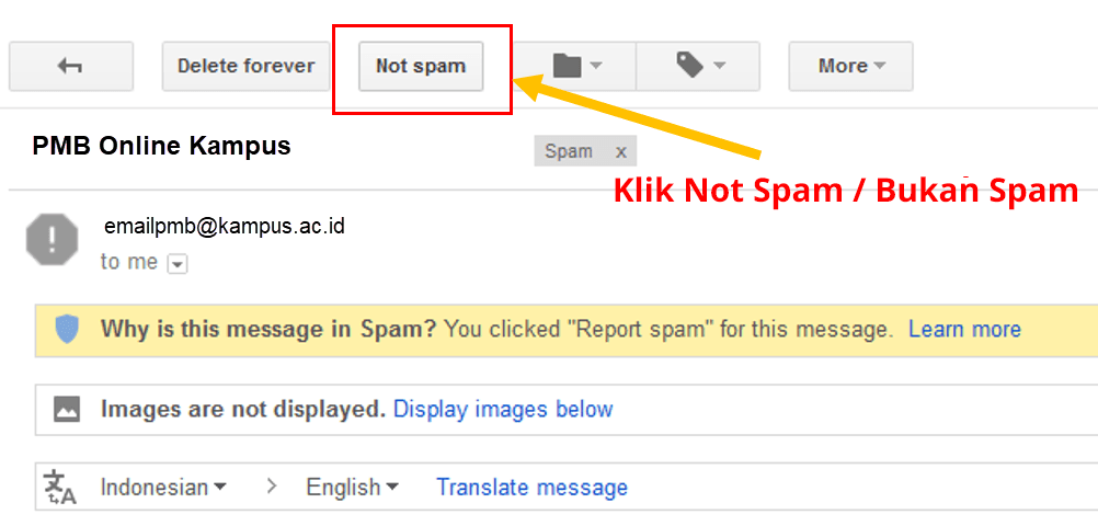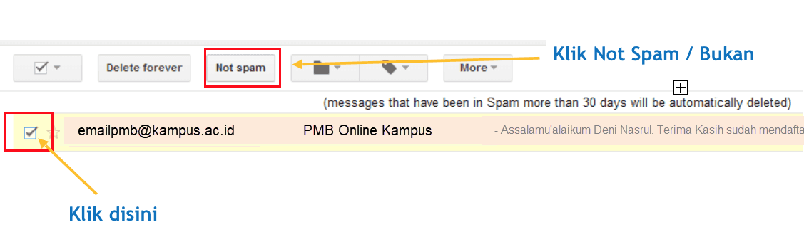 - Jika email aktivasi / notifikasi masuk ke folder spam, tandai email tersebut sebagai bukan spam agar email notifikasi tahapan selanjutnya dari pmb online tidak masuk ke folder spam.