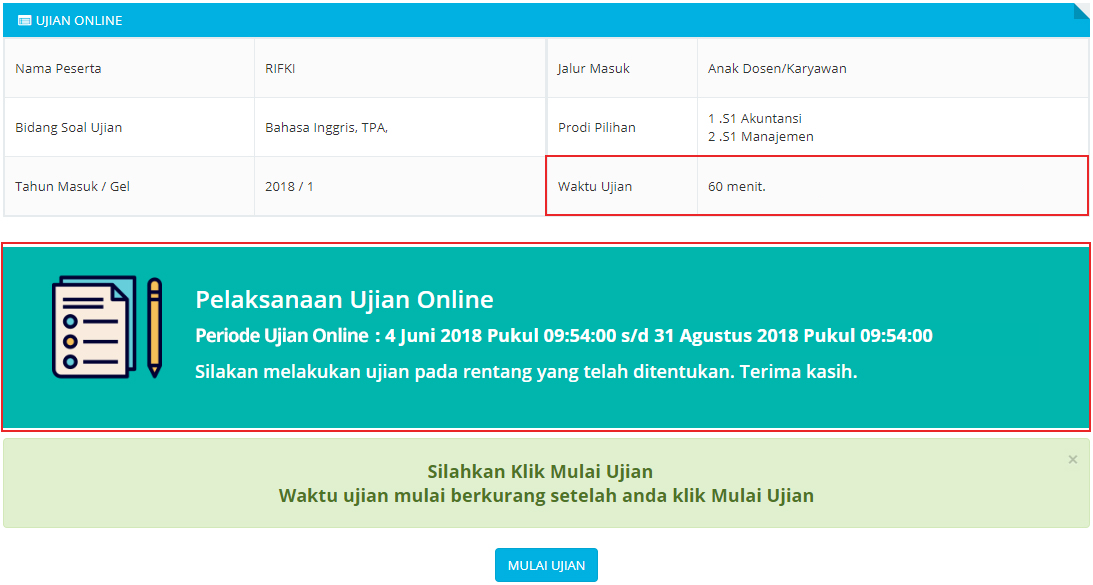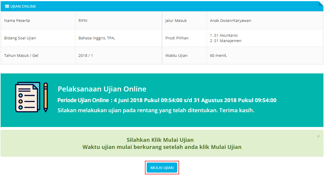 4. Selanjutnya klik tombol mulai ujian