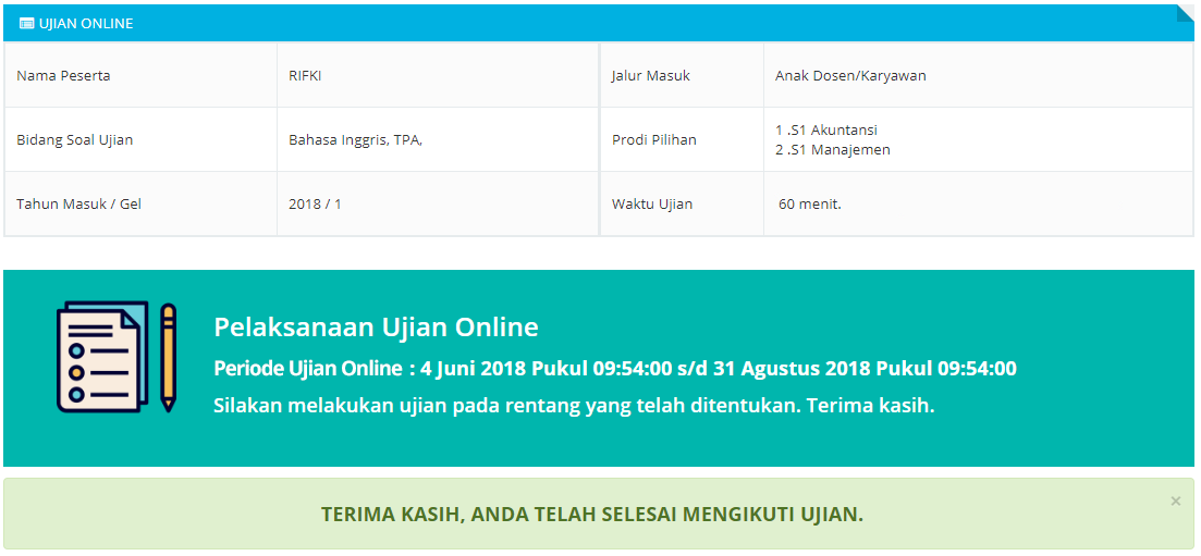 Apabila telah memulai ujian online, peserta ujian harus mengikuti ujian sampai selesai atau sampai waktu ujian habis.