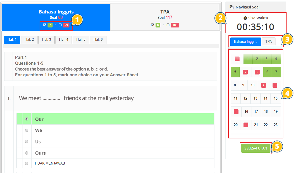 No.5 Selesai Ujian. Bila peserta ujian yakin telah selesai ujian online, silakan untuk tekan tombol “selesai ujian”.