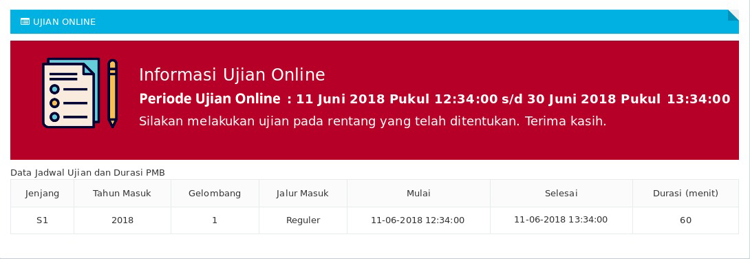 Baca terlebih dahulu keterangan yang tertera pada halaman ujian online, baik rentang tanggal ujian, dan durasi waktu ujian.